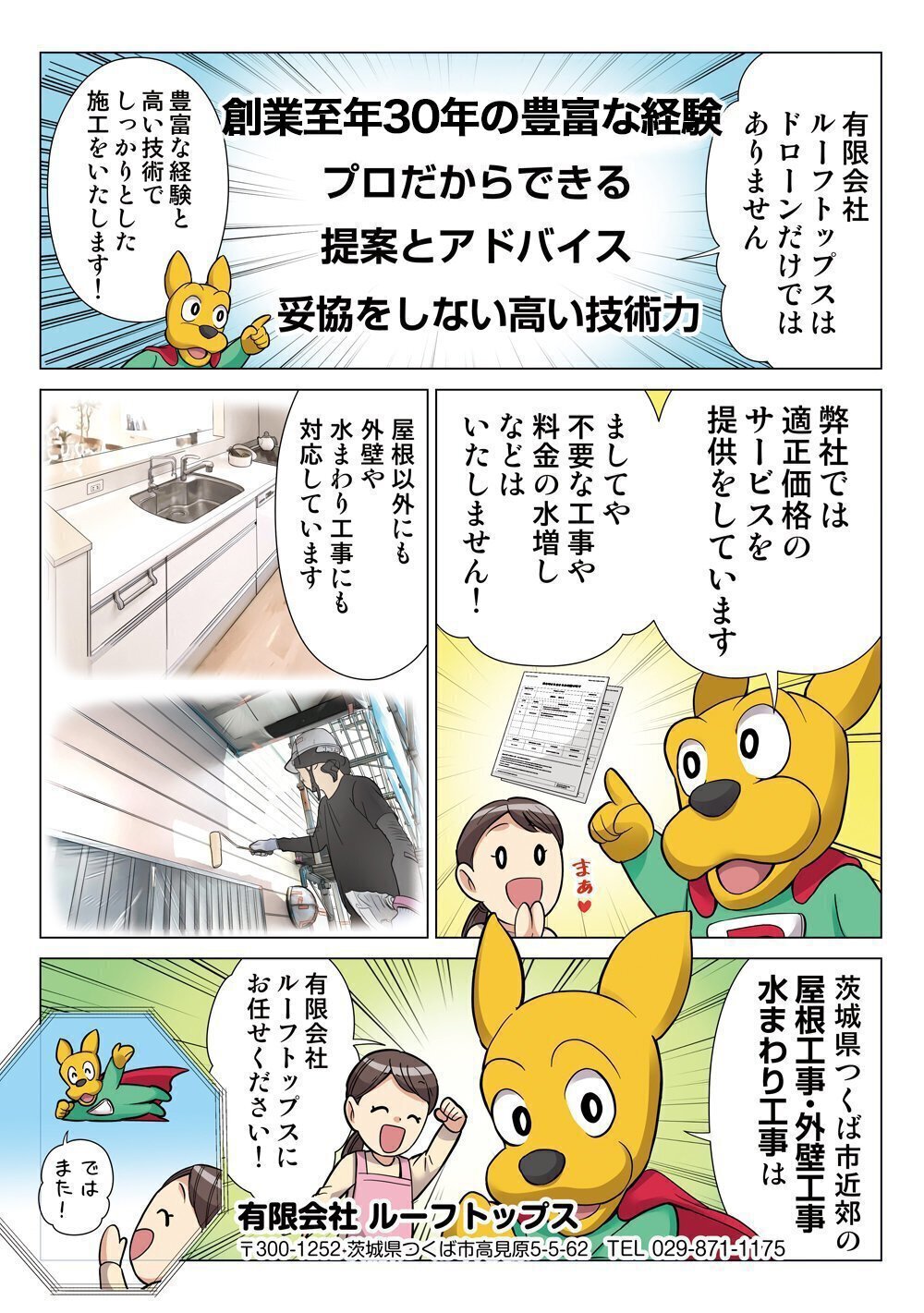 有限会社ルーフトップスの会社概要をご紹介しています。弊社は茨城県つくば市に所在し、屋根工事・外壁工事・水回りリフォーム工事を手掛けています。お客様のお悩み・ご不満を丁寧にお聞きし、最適な施工プランをご提案いたします。