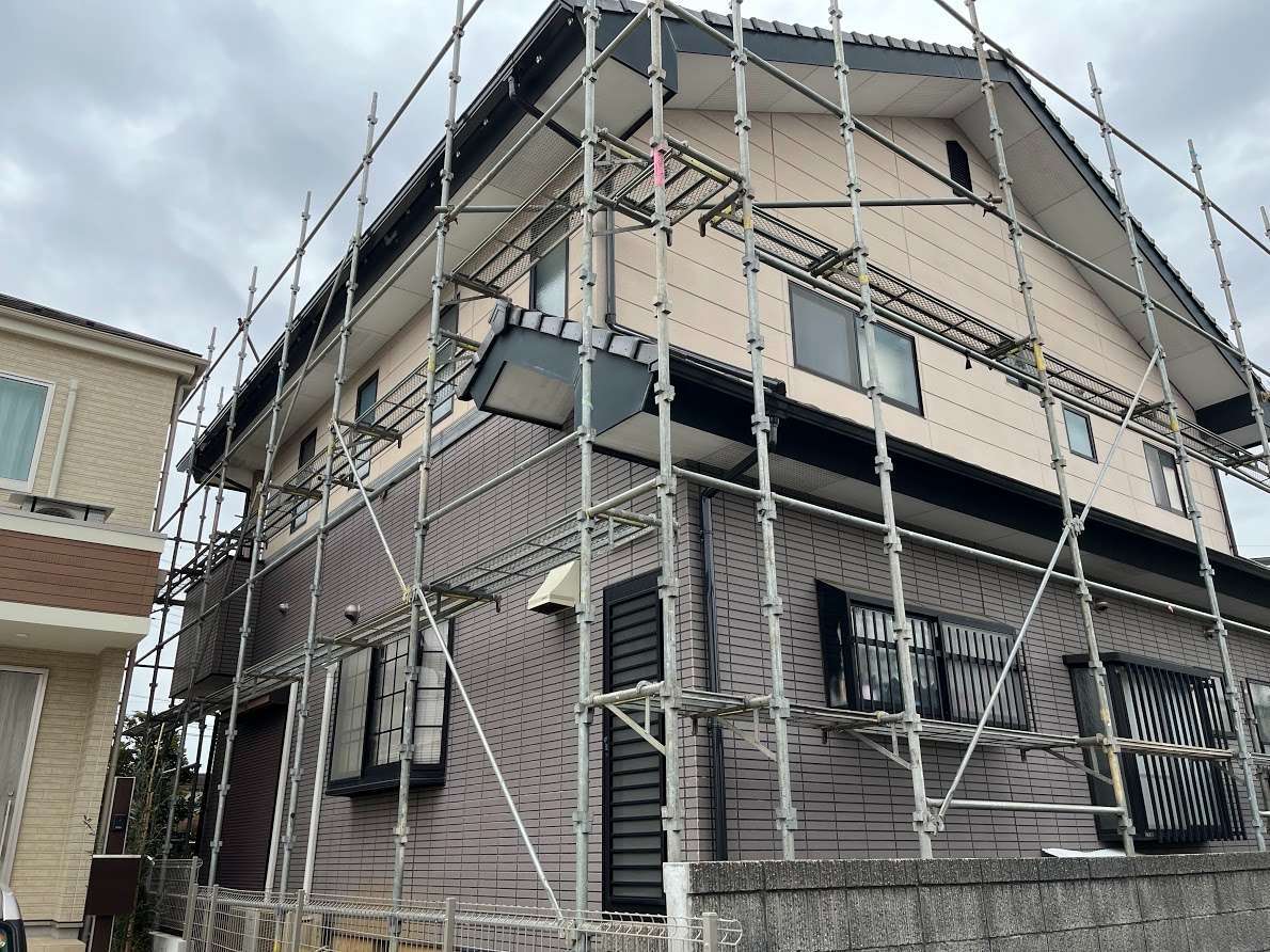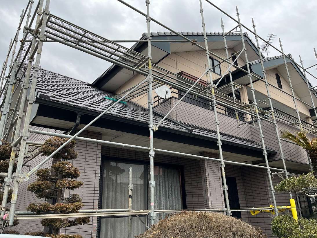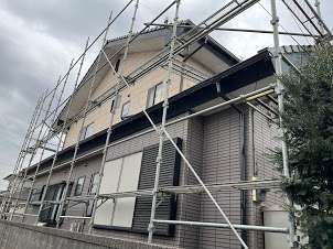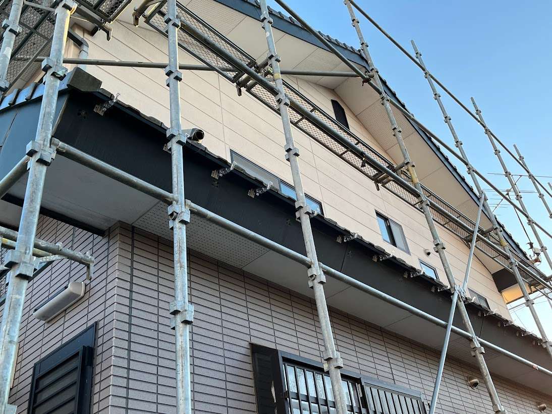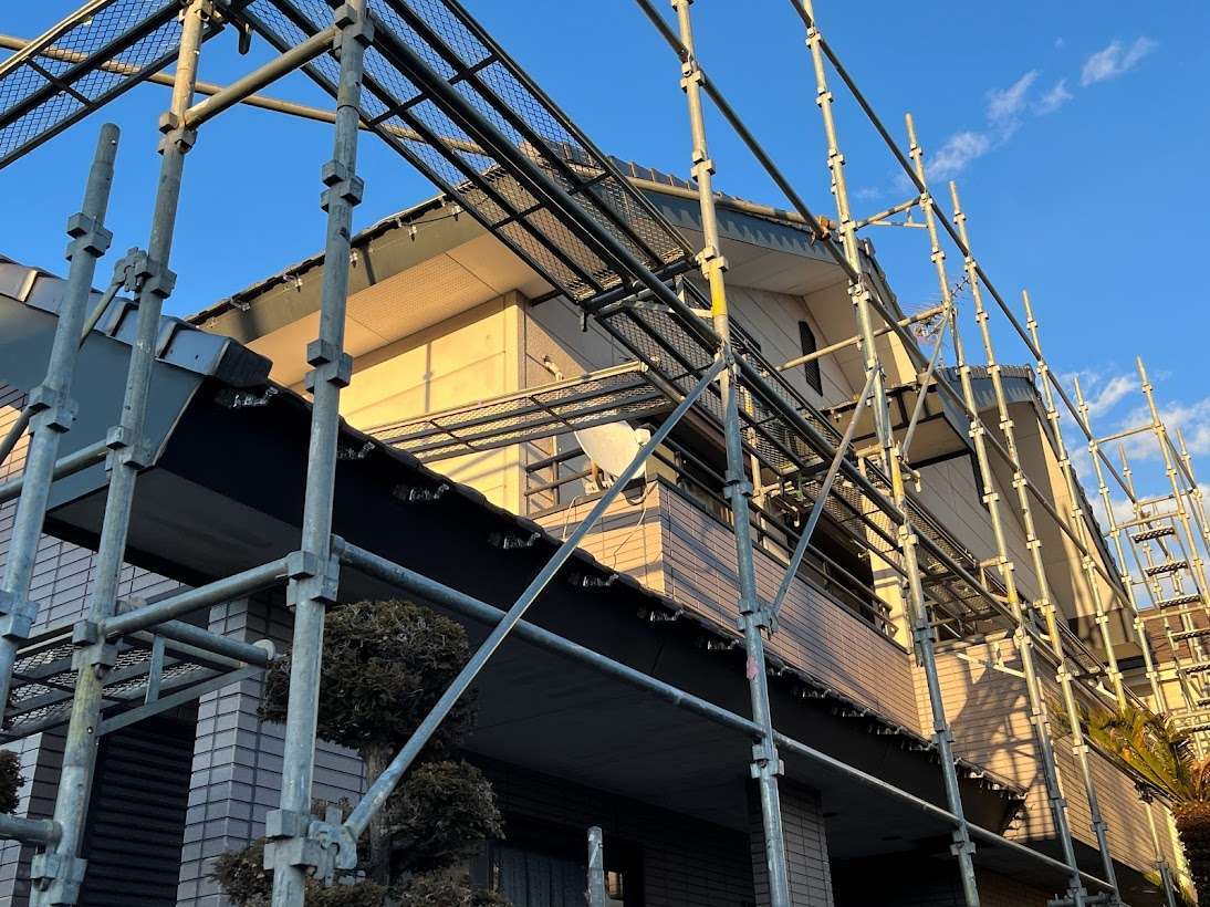昨日、足場の設置後に既設雨樋の撤去および吊り金具の取り付けを行いました。