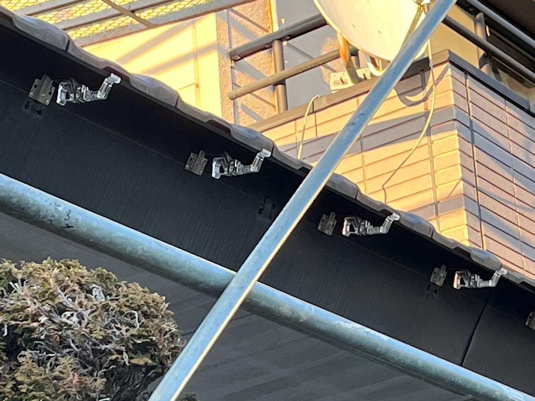(既設の金具を外した後、釘穴にコーキングで防水処理を施し、勾配を取りながら455mm(1尺5寸)間隔で吊り金具をビス固定していきます。)