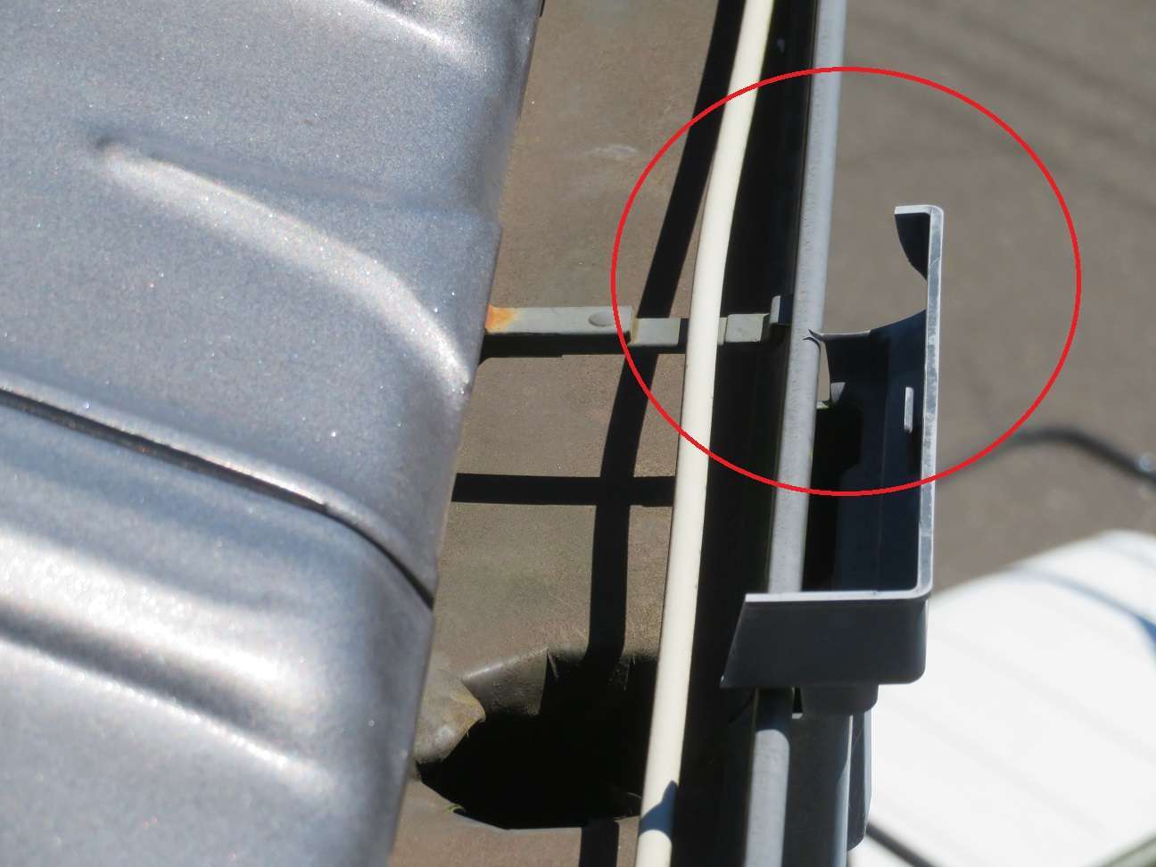 中央が大きくたわんでおり、落とし口も向かって右側1カ所と10mほどの長さがある割に少なく、以下の写真の様にその他にも不具合箇所(自然災害と考えられる)も散見していたので、保険申請をおすすめしました。