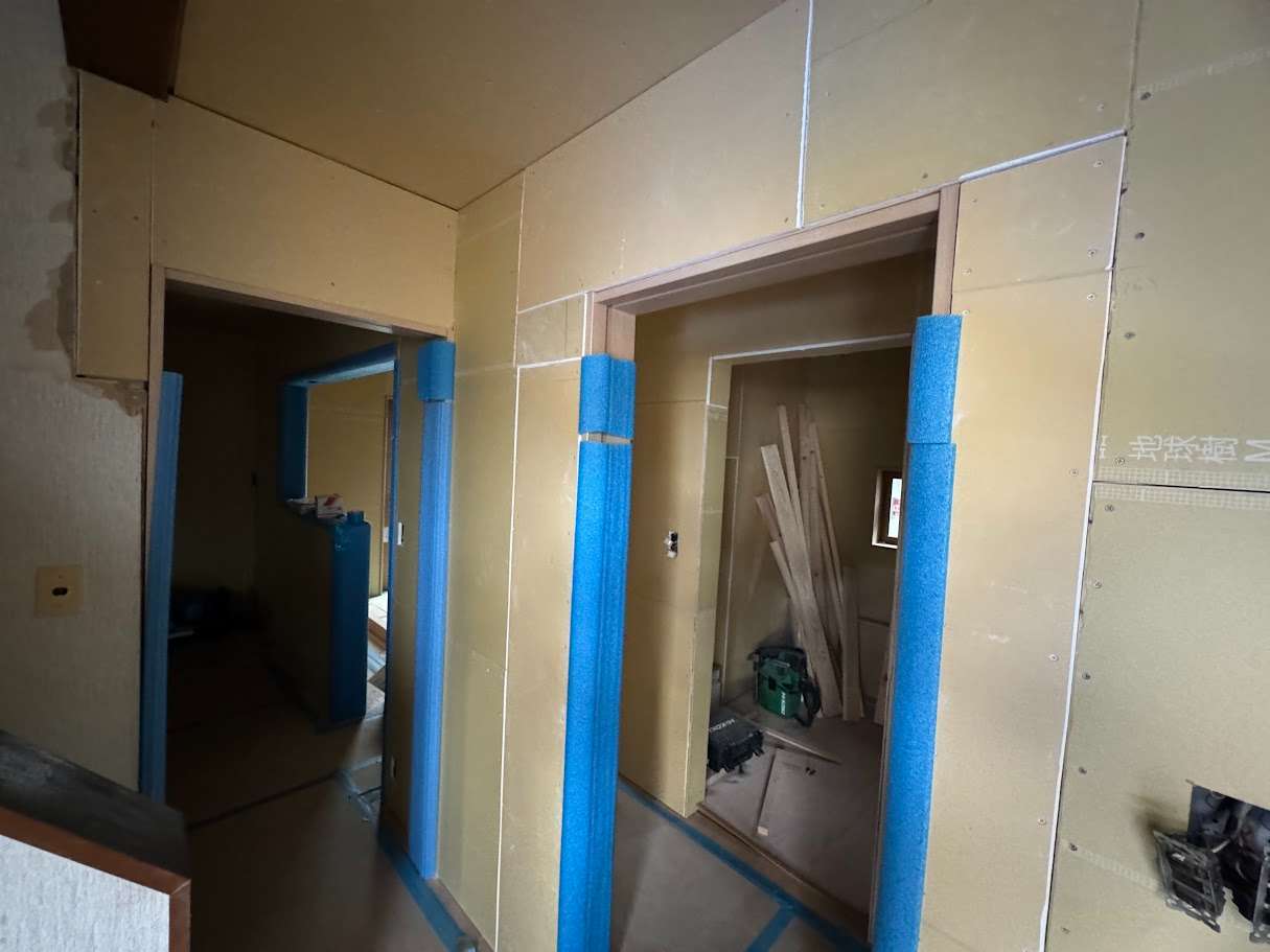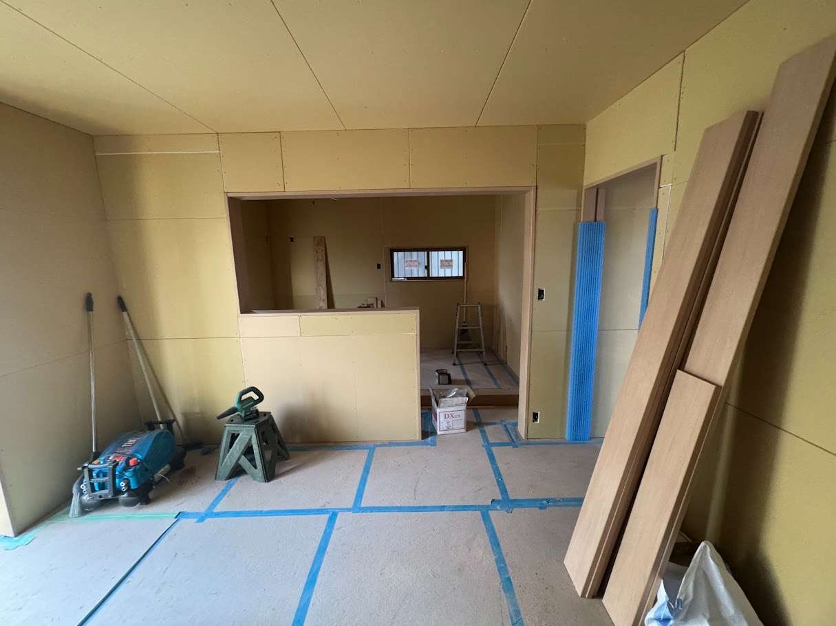 1階のフローリング、壁天井の石こうボード張り、建具や窓枠の取り付けまで終えました。