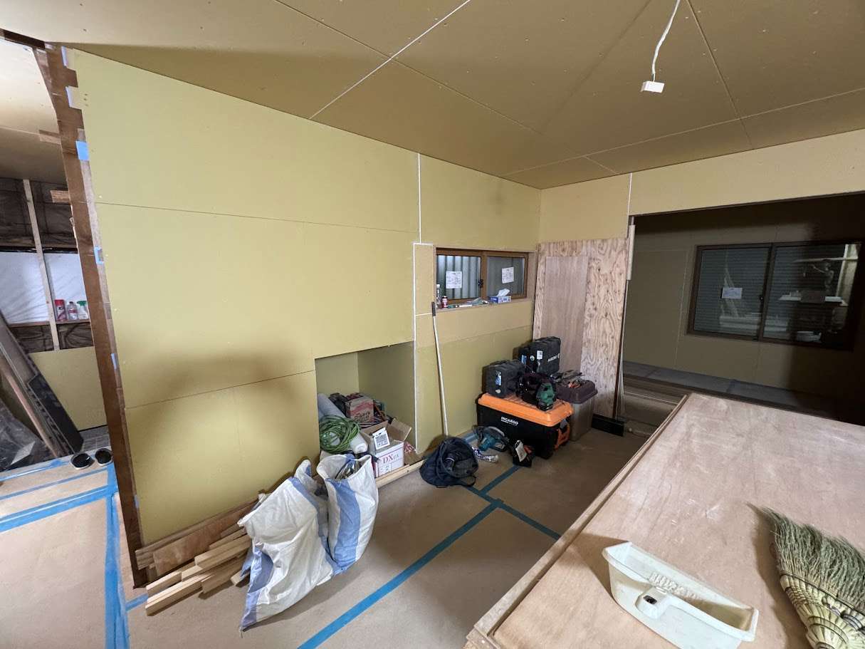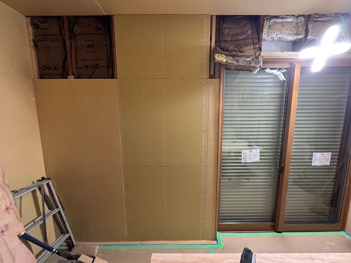 床を張り終えたら、壁のクロス下地となる石膏ボードを張り付けていきます。