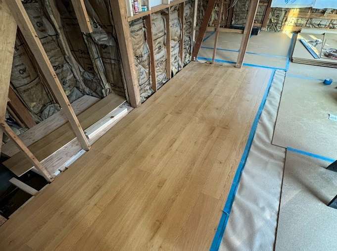 床材を張り終えた箇所から養生シートを敷き、その上に養生ボードを敷き詰めています。