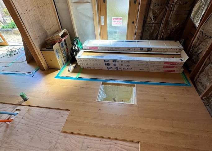 フローリング施工後に養生シート・養生ボードの順に傷などから保護するために養生していきます。