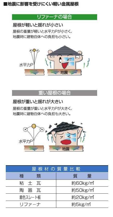 瓦屋根の約1/10という軽さは、建物の耐震性向上につながります。