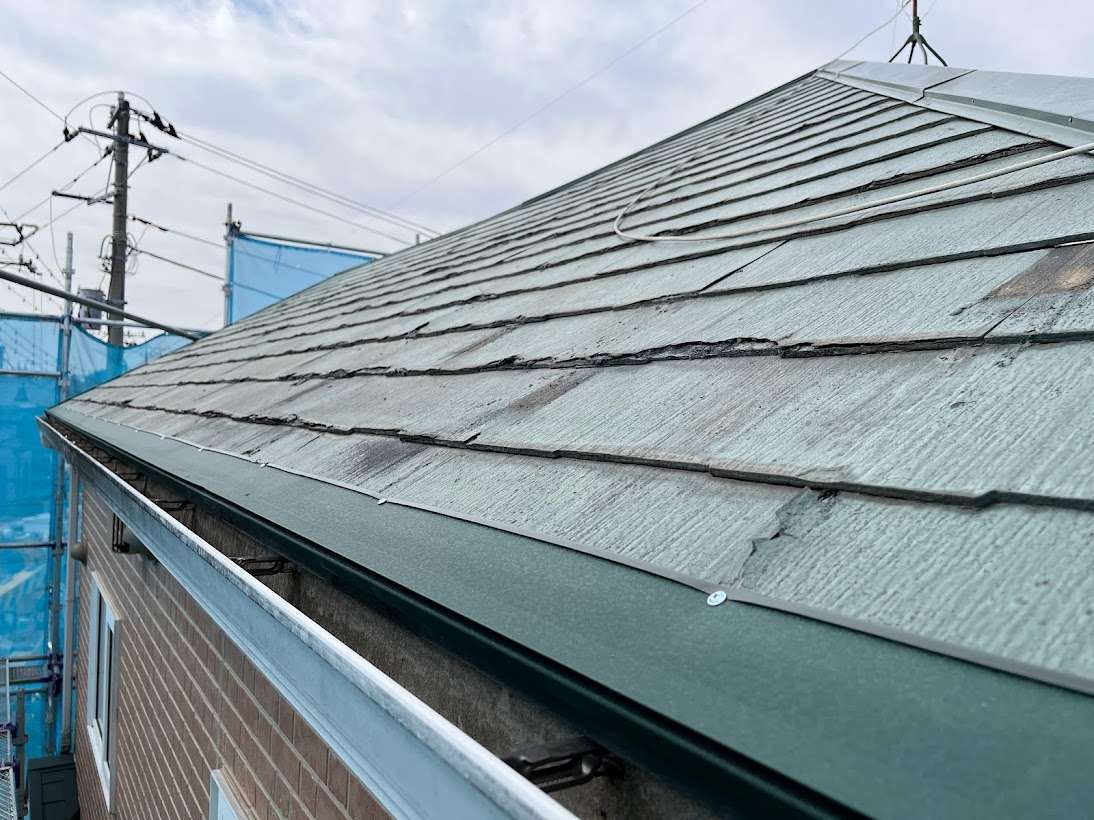 既設屋根材は「パミール」です。ボロボロになってしまう屋根材なので、塗装出来ない屋根としてご存じの方も多いと思います。