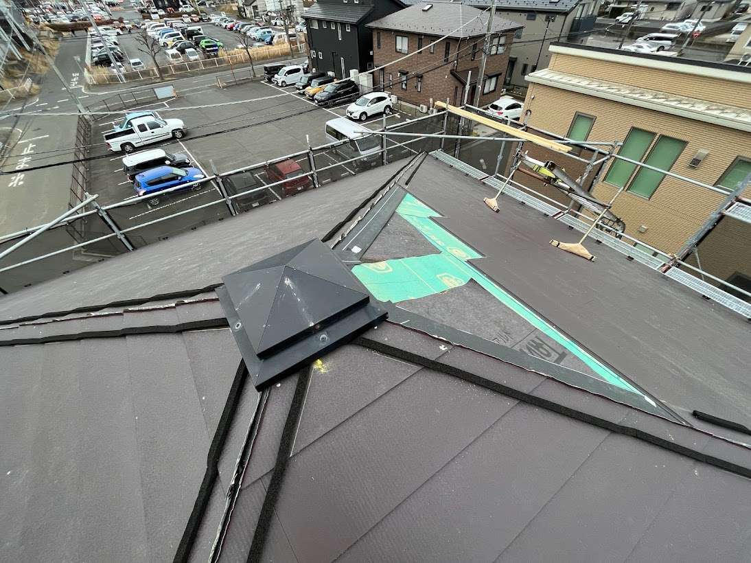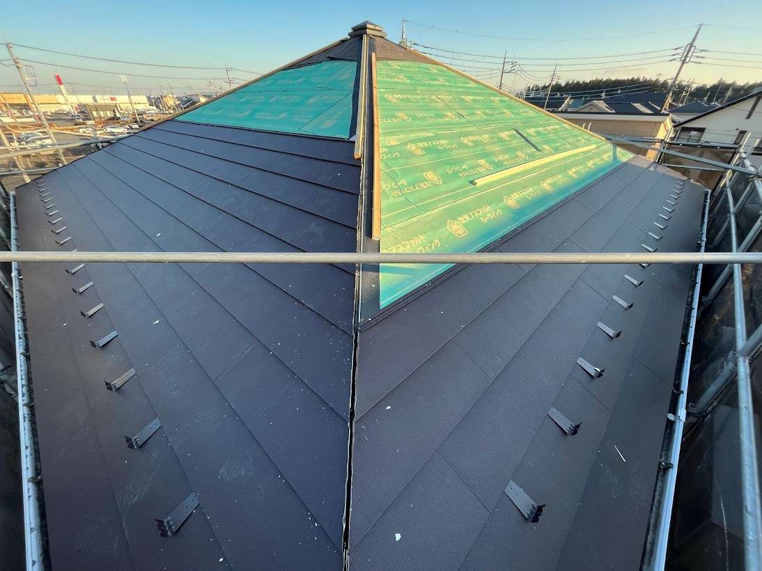 3日目は全体の95%ほどを葺き終えて、棟包を取り付ける予定の箇所にエプトシーラー貼付けました。