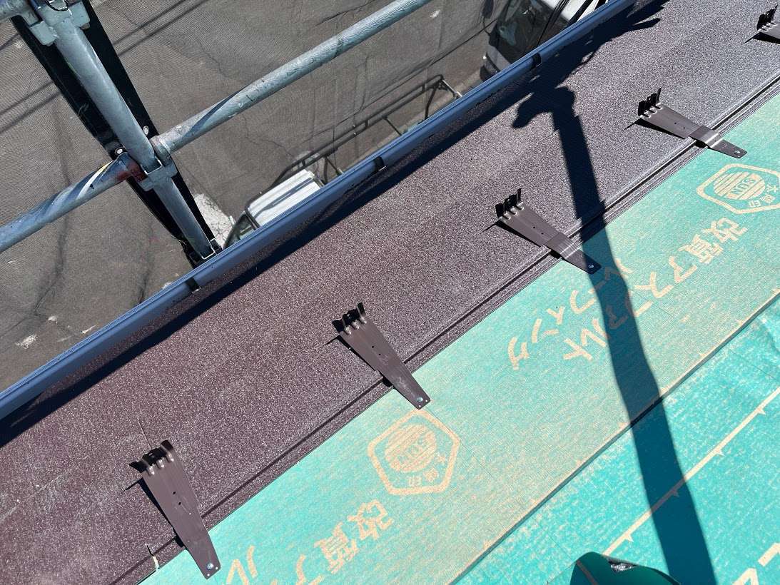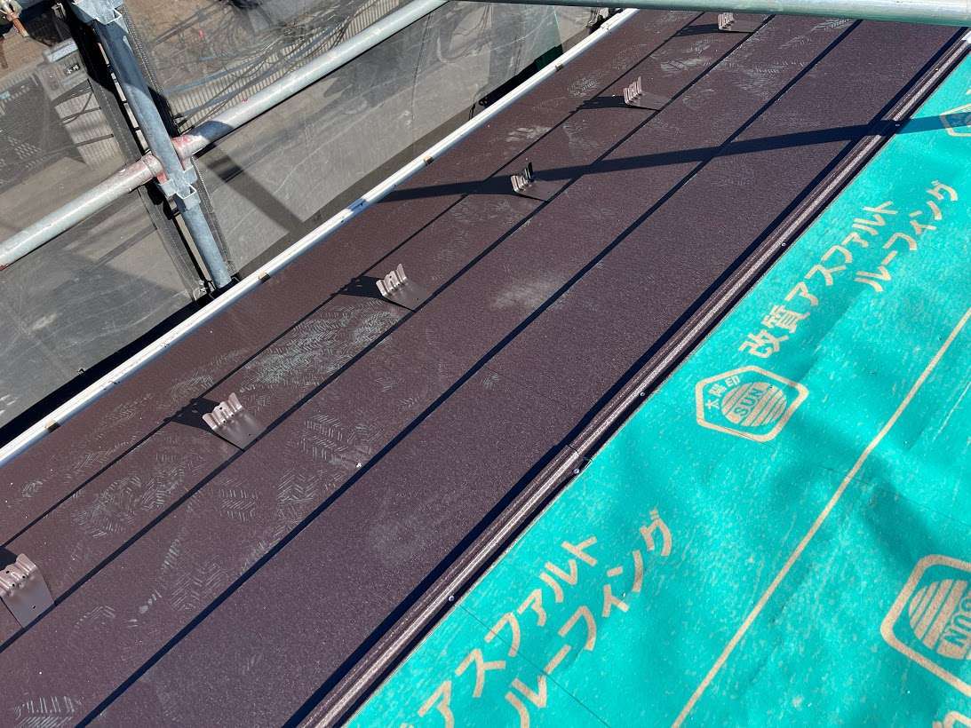 本体屋根材を2段葺いたところで、先付け用の雪止め金具を挟み込む様に固定していきます。(因みに455mmピッチで1列に止めていく方法を「一文字」などと表現します。この方法は下地の屋根垂木にビスを利かせる点と次に重ねる屋根材が曲がりにくくなるという利点があると考えてこのようにしています。)