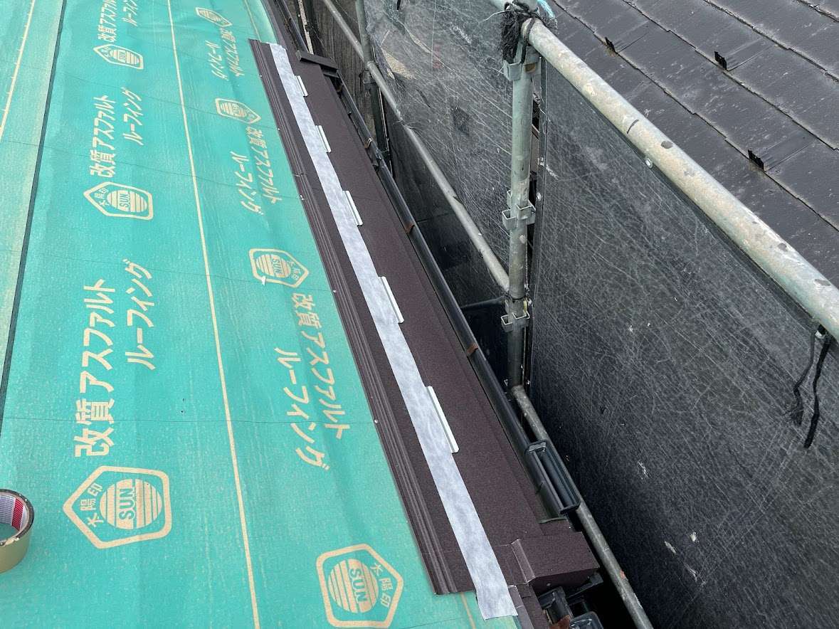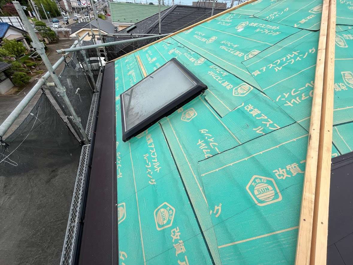 粘着タイプの下葺き材「貼ってGO」を全面に貼り付けた後、「シルキーG2」の施工を進めていきます。