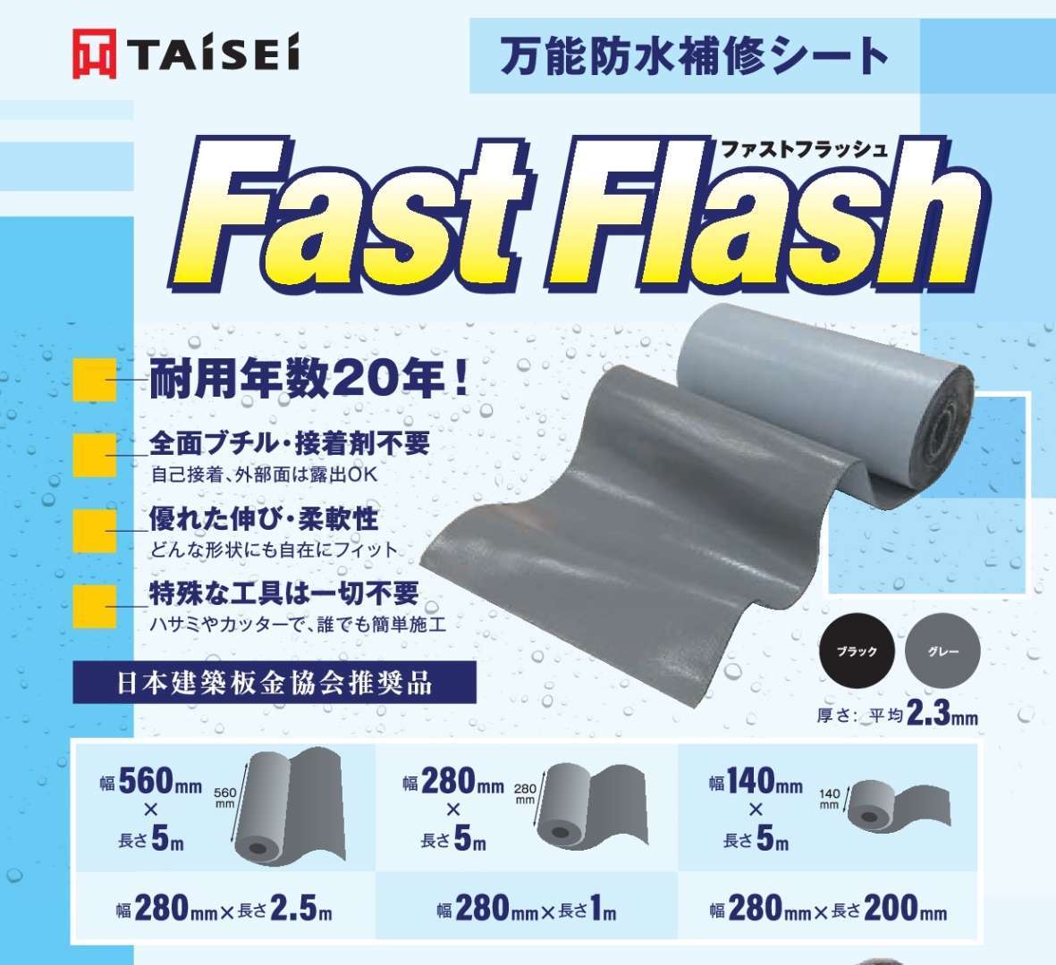 結論は今日の作業でもお分かりいただけると思いますが、屋根に煙突という形になりましたので、当社としてお手伝いできる範囲で煙突廻りの防水材として「ファストフラッシュ」という製品を提供しました。