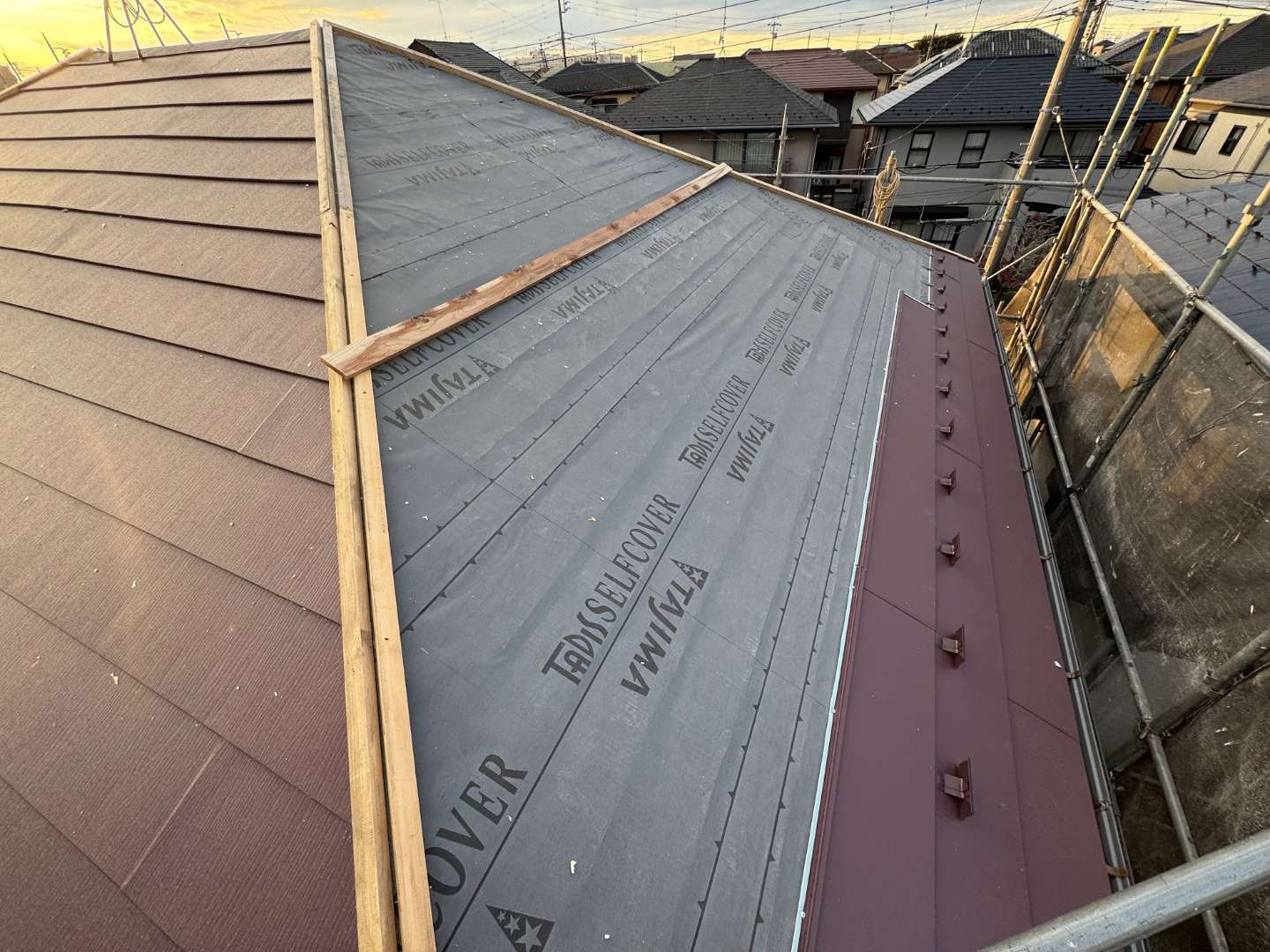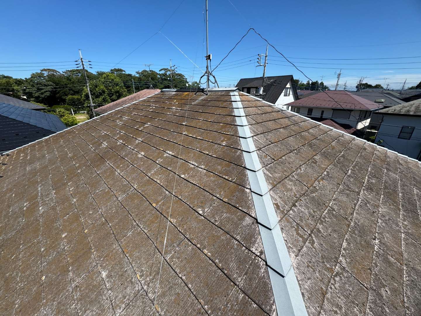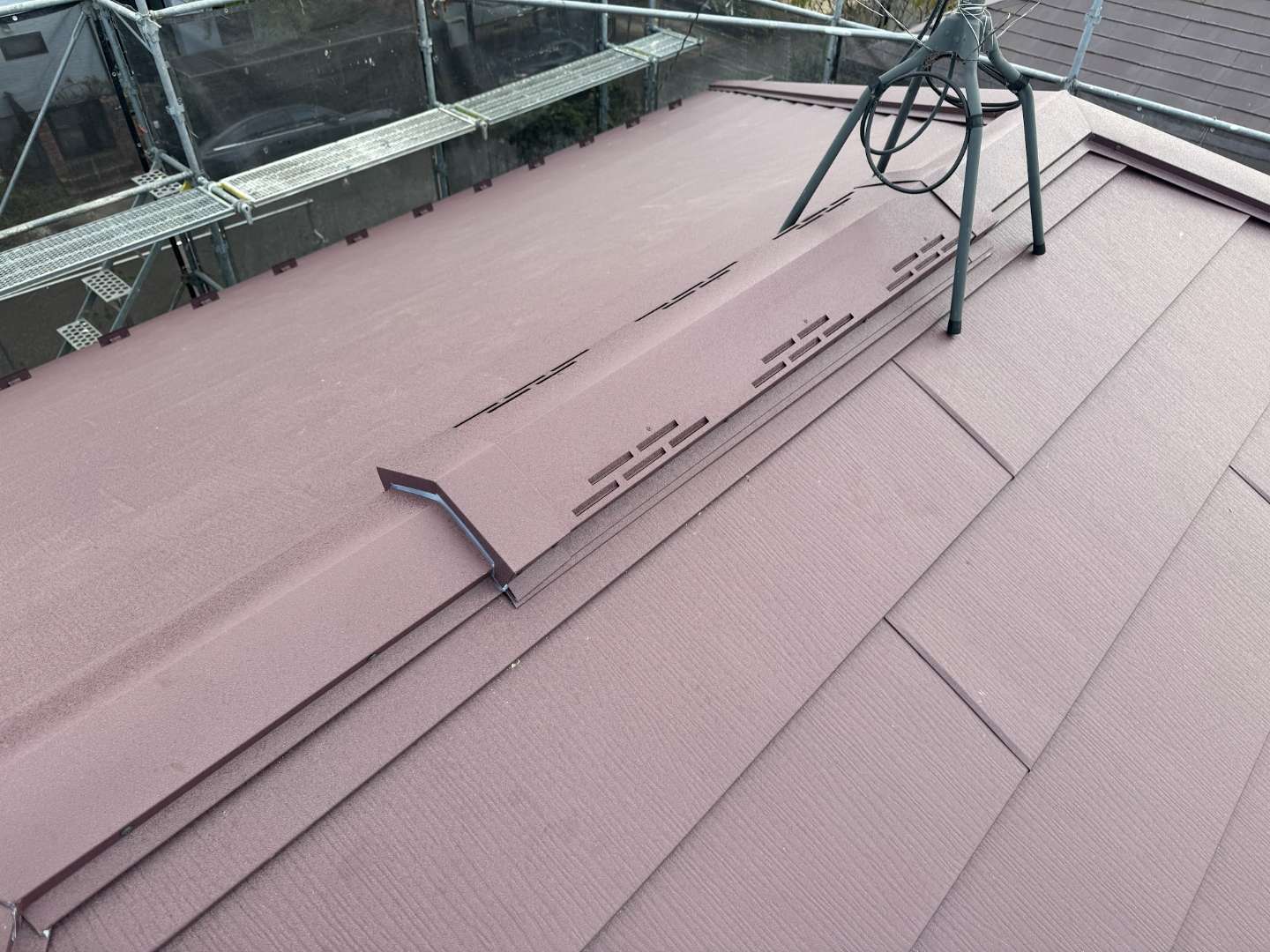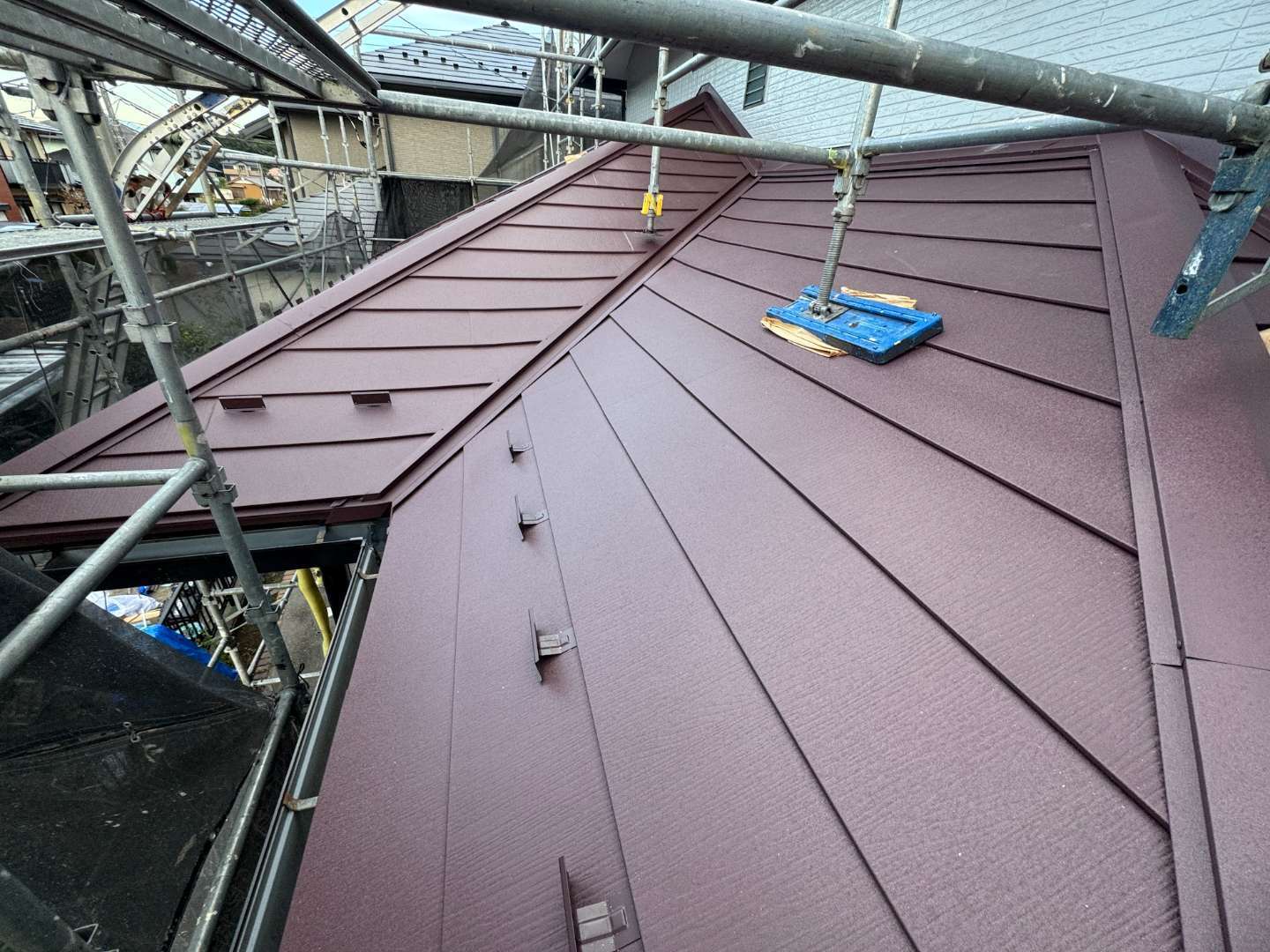 New 戸建て スーパーガルテクト 茨城県牛久市 戸建住宅リフォーム リフォーム工事 金属系屋根施工(ガルバリウム鋼板) 屋根カバー工法 屋根工事 茨城県牛久市 屋根カバー工事「スーパーガルテクト」 取引先電気工事店の依頼で茨城県牛久市(戸建て住宅)の屋根カバー工事を行いました。ハウスメーカーの平板スレート葺きで5寸勾配の寄棟屋根、塗膜劣化とコケ類の発生が著しく雨後の乾いていない状況では屋根に上がることはできませんでした。一旦、塗装工事の職人さんにお願いして高圧洗浄機で屋根面のコケなどを落としてもらってから作業に着手しました。施工屋根材:アイジー工業「スーパーガルテクト」ワインレッド 竣工日 2025.11.8 場所 茨城県牛久市 施工内容 アイジー工業「スーパーガルテクト」によるカバー工事 施工者 有限会社ルーフトップス 前の施工事例 戸建て 茨城県牛久市 玄関ドアリフォーム工事
